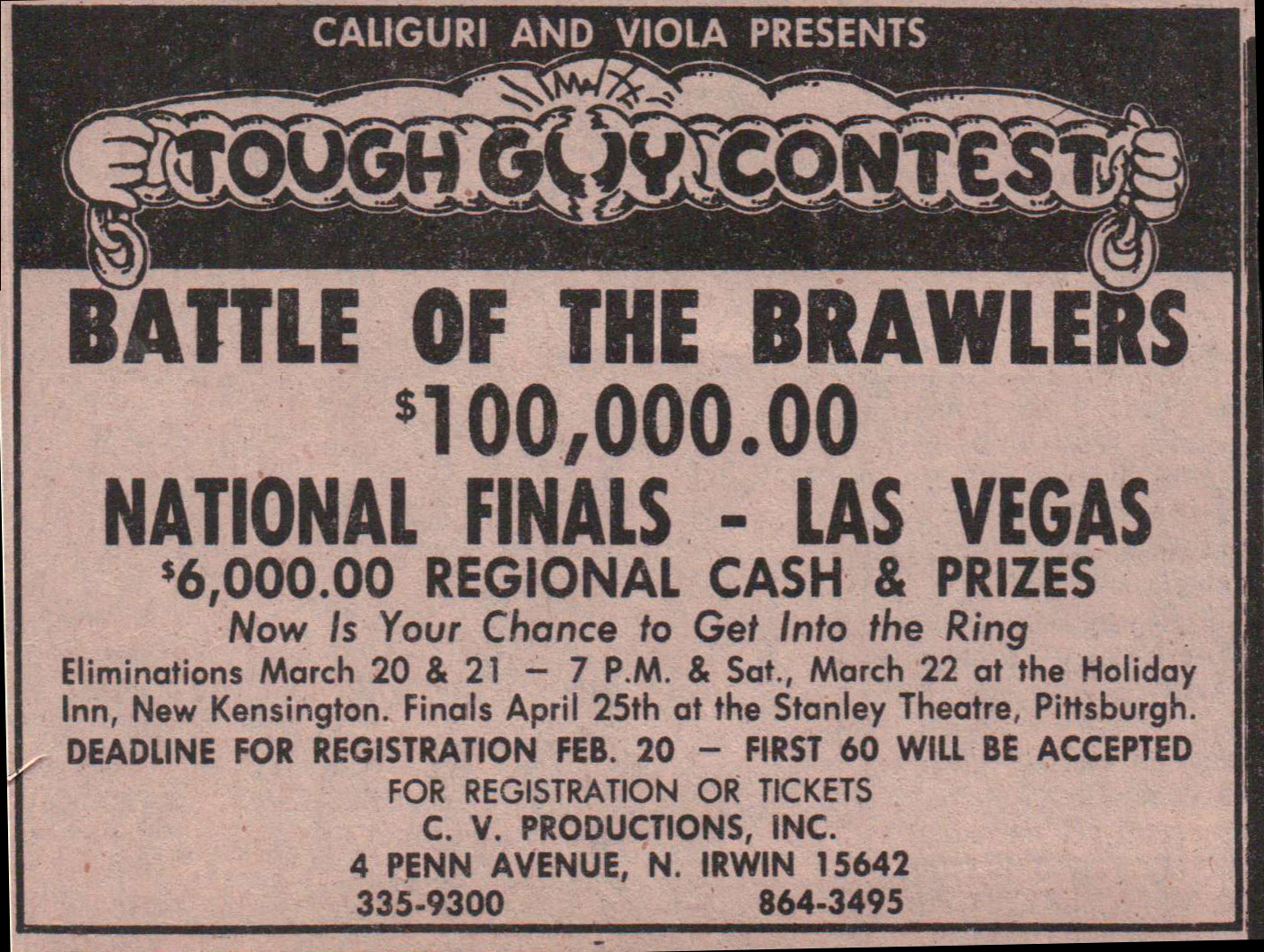 Here are highlights from 1980 Tough Guy Contest show at the Stanley Theater in Pittsburgh, PA. Promoted by CV (Caliguri and Viola) Productions the first MMA company in America. More info visit www.toughguycontest.com