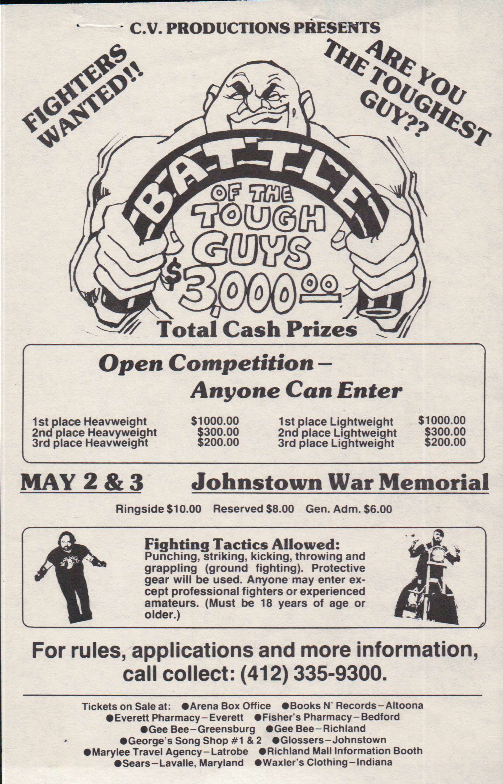 CV Productions introduced open regulated mixed martial arts competitions to the United States March 20, 1980 in Pittsburgh, PA with the inaugural “Battle of the Tough Guys” championship. This was the first commercial MMA success and the beginning of a new sport.